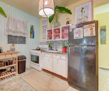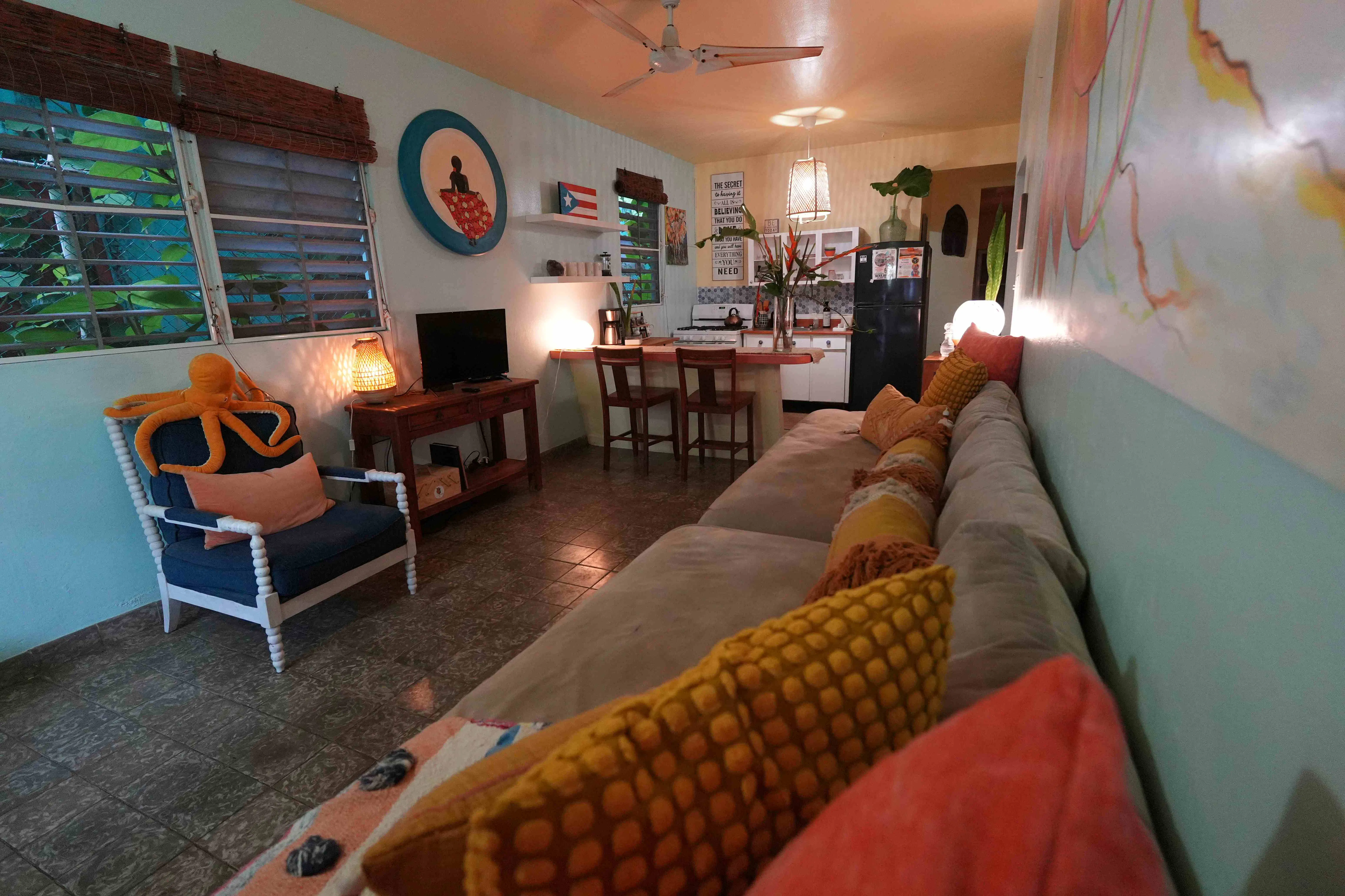 Experience cozy, tropical rooms with high quality sheets, soft cotton towels, and colorful art-inspired decor. Each room offers ample closet space, Air Conditioner, high-speed ceiling fans, and a fully stocked bathroom with shampoos, soaps, and a homemade sugar scrub. Enjoy a heated shower and warm greetings from friendly local residents.